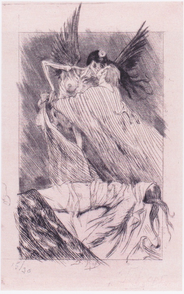 We offer you a handcrafted reproduction on canvas of the famous artwork 'Kisses of Death' by Felicien Rops, from the Reproduction Museum.