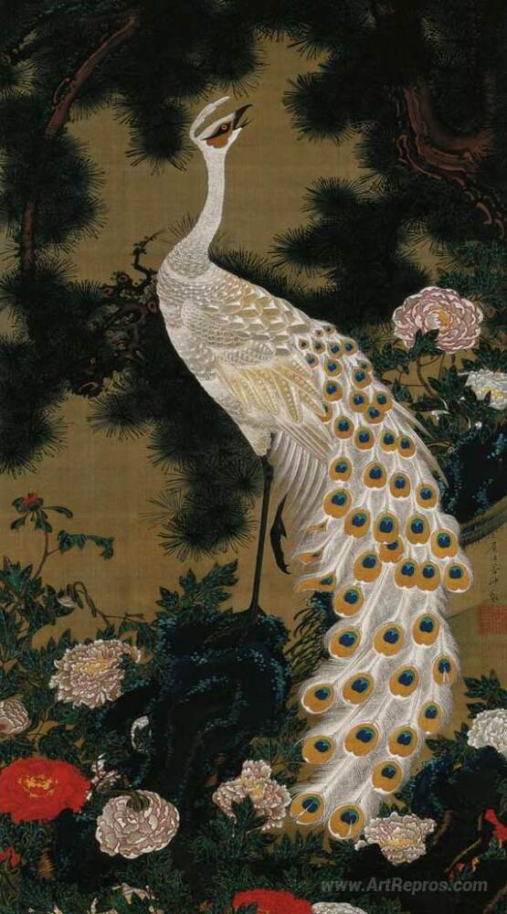 We offer you a handcrafted reproduction on canvas of the famous artwork 'Old Pine Tree and Peacock' by Ito Jakuchu, from the Reproduction Museum.