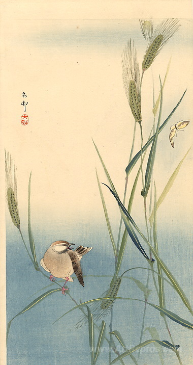 We offer you a handcrafted reproduction on canvas of the famous artwork 'Songbird on Barley Stalk' by Ohara Koson, from the Reproduction Museum.