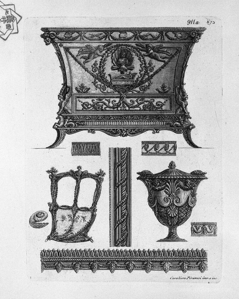We offer you a handcrafted reproduction on canvas of the famous artwork 'A chest of drawers, a side of the sedan, a decorative vase and v' by Giovanni Battista Piranesi, from the Reproduction Museum.