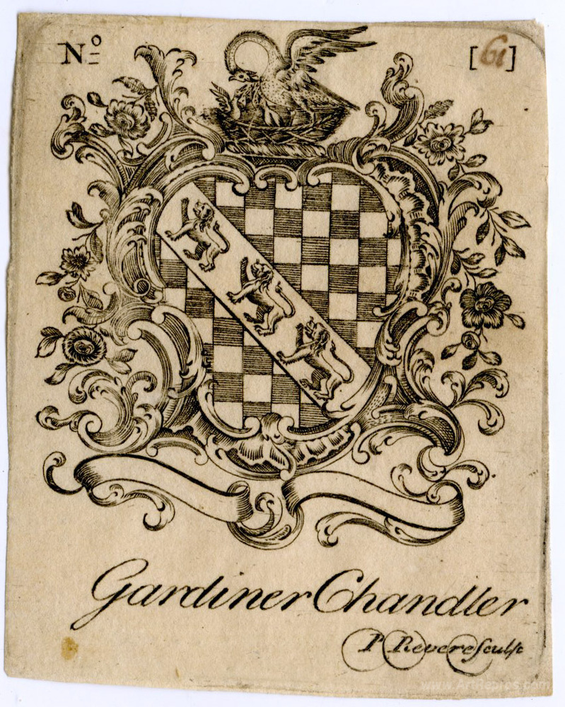 We offer you a handcrafted reproduction on canvas of the famous artwork 'Gardiner Chandler Bookplate ' by Paul Revere, from the Reproduction Museum.