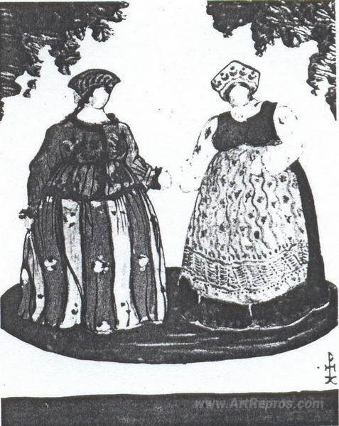 We offer you a handcrafted reproduction on canvas of the famous artwork 'Sketches of costumes for "Tale of Tsar Saltan"' by Nicholas Roerich, from the Reproduction Museum.