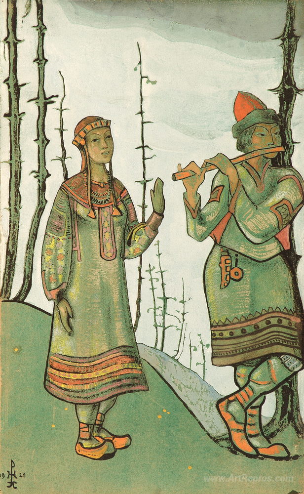 We offer you a handcrafted reproduction on canvas of the famous artwork 'Snow Maiden and Lel' by Nicholas Roerich, from the Reproduction Museum.
