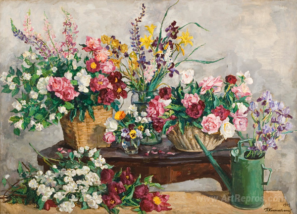 We offer you a handcrafted reproduction on canvas of the famous artwork 'Still Life. Four bouquets on the table and watering can.' by Pyotr Konchalovsky, from the Reproduction Museum.