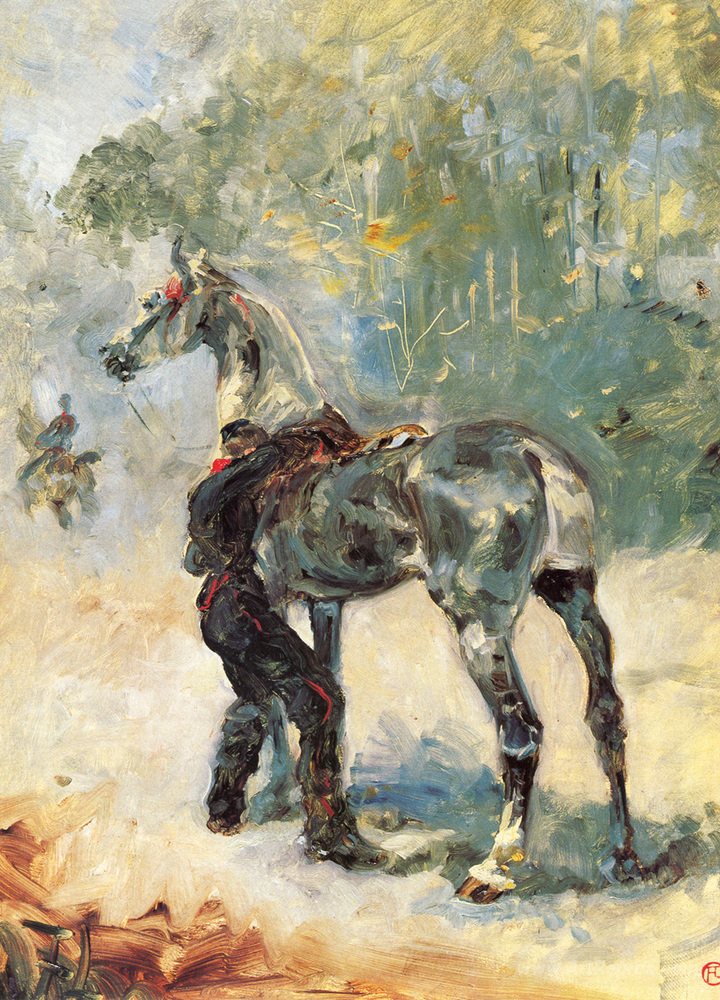 We offer you a handcrafted reproduction on canvas of the famous artwork 'Artilleryman Saddling His Horse' by Henri de Toulouse-Lautrec, from the Reproduction Museum.