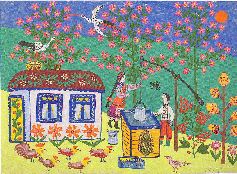 We offer you a handcrafted reproduction on canvas of the famous artwork 'At the Well' by Maria Primachenko, from the Reproduction Museum.
