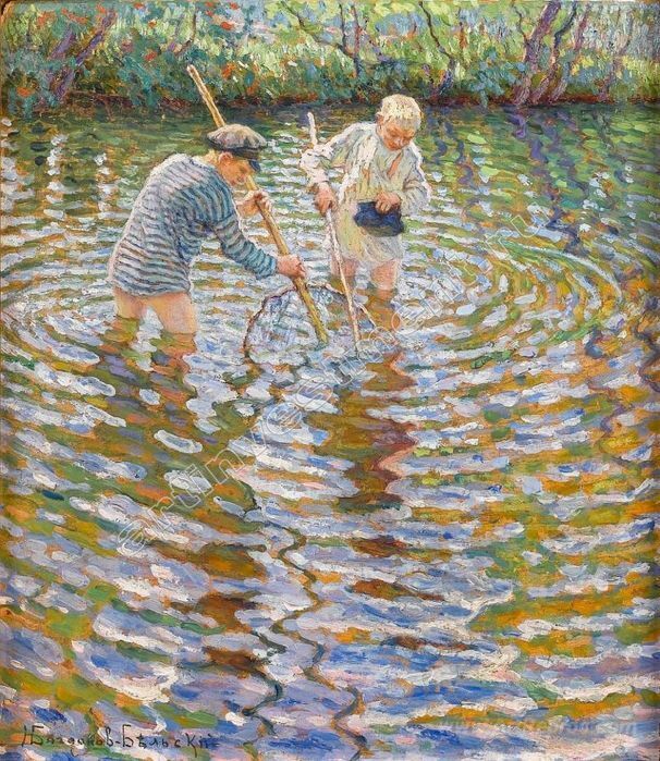 Welcome to our curated collection of exquisite oil paintings, where each artwork tells a unique story. One of our standout pieces, Boys Catching Fish, is masterfully crafted by the renowned artist Nikolay Bogdanov-Belsky. Known for his enchanting depictions of rural life and childhood, Bogdanov-Belsky’s style combines realism with a touch of impressionistic flair, drawing viewers into the serene beauty of everyday moments.