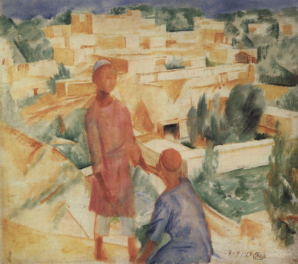 We offer you a handcrafted reproduction on canvas of the famous artwork 'Boys on the background of the city ' by Kuzma Petrov-Vodkin, from the Reproduction Museum.