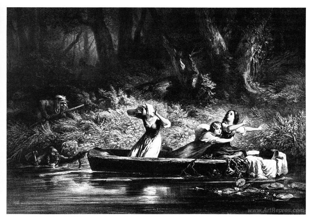 We offer you a handcrafted reproduction on canvas of the famous artwork 'Capture of the Daughters of D. Boone and Callaway by the Indians' by Karl Bodmer, from the Reproduction Museum.