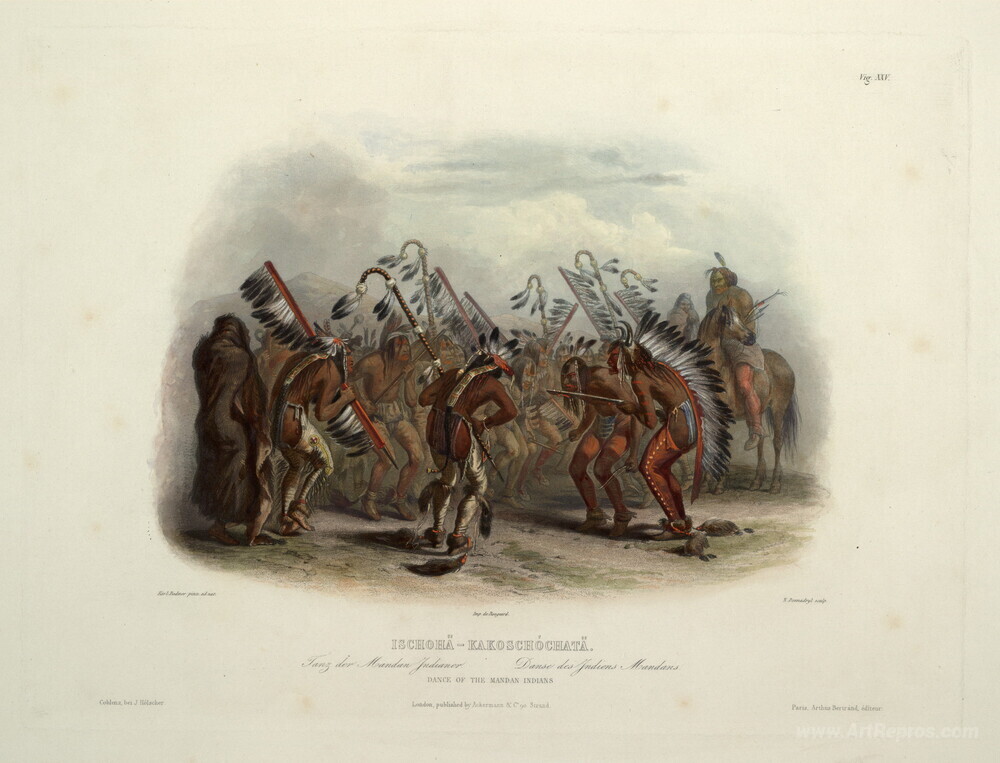 We offer you a handcrafted reproduction on canvas of the famous artwork 'Ischohä Kakoschochatä Dance of the Mandan Indians, plate 25 from' by Karl Bodmer, from the Reproduction Museum.