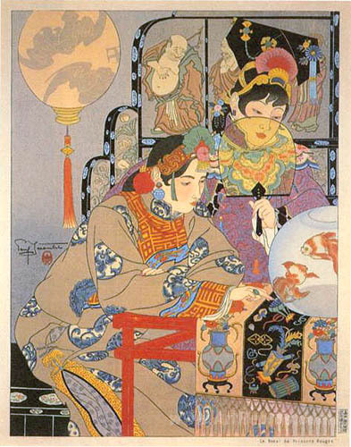 We offer you a handcrafted reproduction on canvas of the famous artwork 'Le Bocal De Poissons Rouges' by Paul Jacoulet, from the Reproduction Museum.