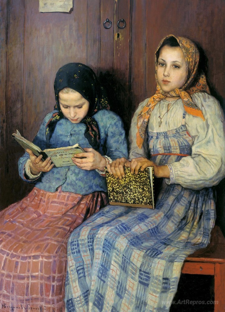 We offer you a handcrafted reproduction on canvas of the famous artwork 'Schoolgirls' by Nikolay Bogdanov-Belsky, from the Reproduction Museum.