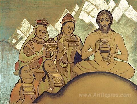 We offer you a handcrafted reproduction on canvas of the famous artwork 'The Sacred Gift' by Nicholas Roerich, from the Reproduction Museum.