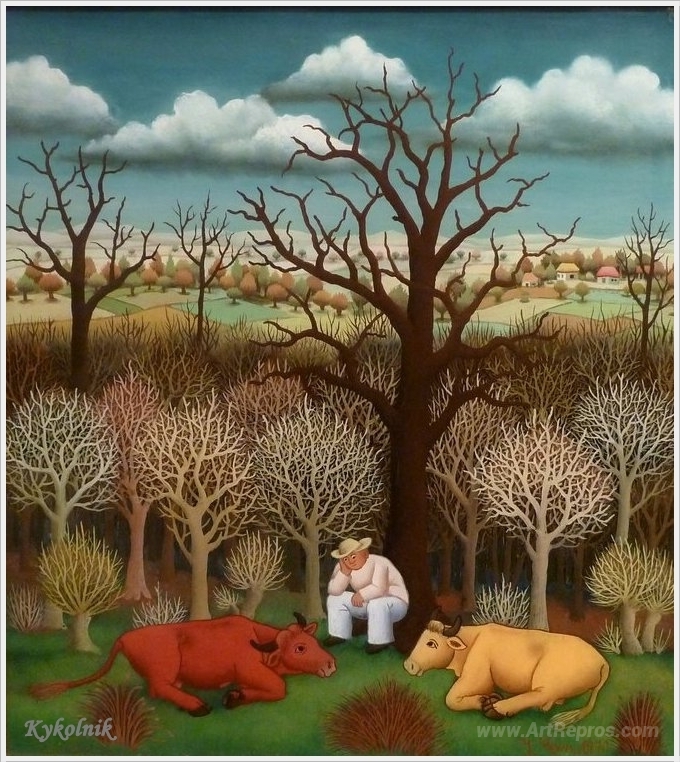 We offer you a handcrafted reproduction on canvas of the famous artwork 'Watching over two cows ' by Ivan Generalic, from the Reproduction Museum.