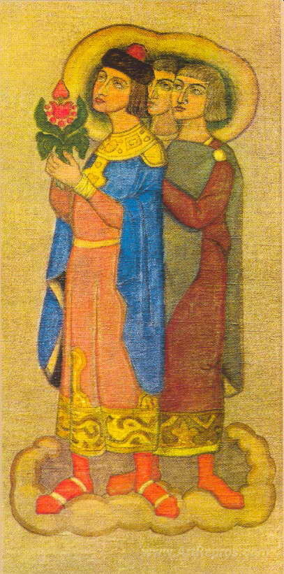 We offer you a handcrafted reproduction on canvas of the famous artwork 'Young men, successors' by Nicholas Roerich, from the Reproduction Museum.