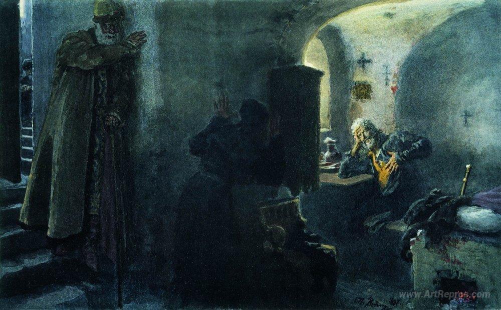 We offer you a handcrafted reproduction on canvas of the famous artwork 'Monk Filaret Imprisoned in the Antonievo-Siyskiy Monastery' by Ilya Repin, from the Reproduction Museum.