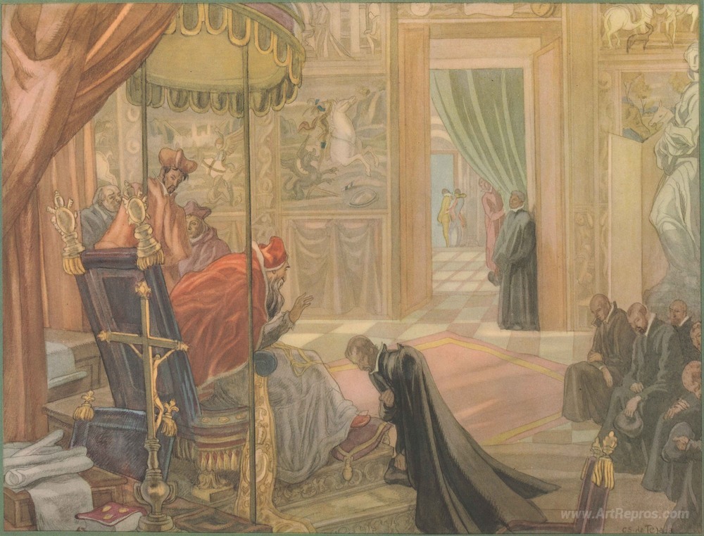We offer you a handcrafted reproduction on canvas of the famous artwork 'The Life of St. Ignatius Loyola. Plate 7. Pope Paul III approves' by Carlos Saenz de Tejada, from the Reproduction Museum.