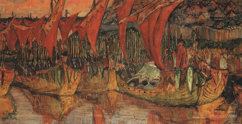 We offer you a handcrafted reproduction on canvas of the famous artwork 'Vladimir campaign to Korsun (Red Sails)' by Nicholas Roerich, from the Reproduction Museum.