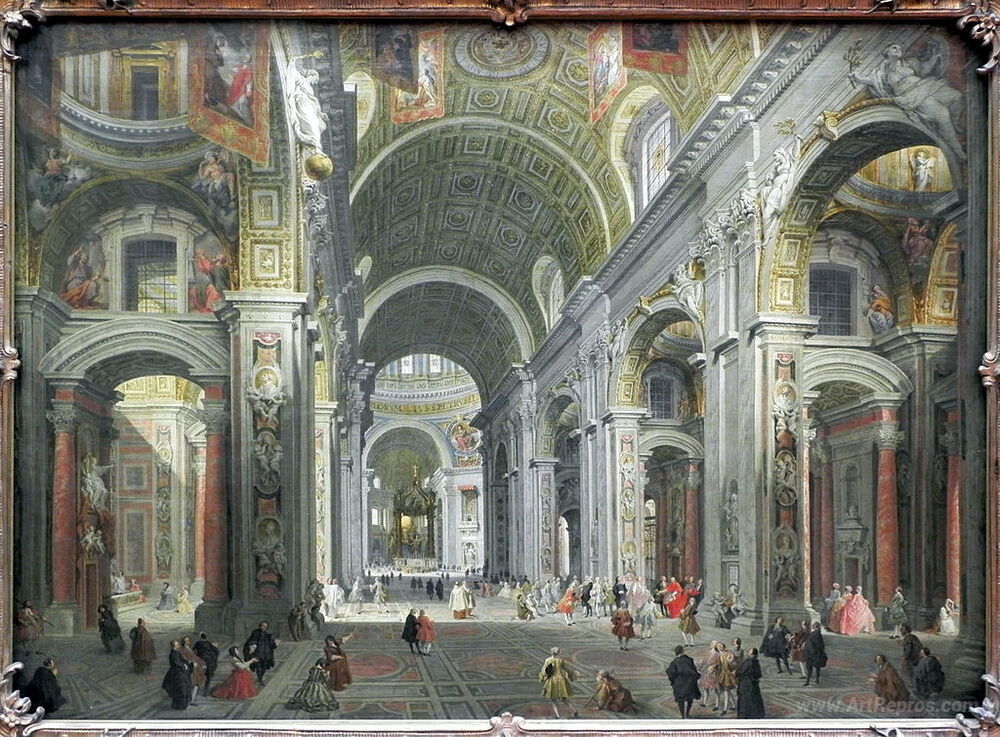 We offer you a handcrafted reproduction on canvas of the famous artwork 'Interior of St. Peter's, Rome' by Giovanni Paolo Panini, from the Reproduction Museum.