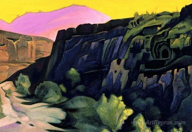 We offer you a handcrafted reproduction on canvas of the famous artwork 'Ajanta. The rock temples.' by Nicholas Roerich, from the Reproduction Museum.