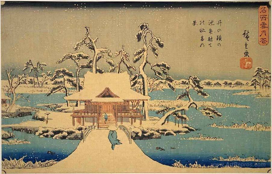 We offer you a handcrafted reproduction on canvas of the famous artwork 'Benzaiten Shrine at Inokashira in Snow' by Hiroshige, from the Reproduction Museum.