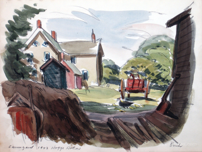 We offer you a handcrafted reproduction on canvas of the famous artwork 'Farmyard, Hogg’s Hollow, Toronto ' by Jack Bush, from the Reproduction Museum.