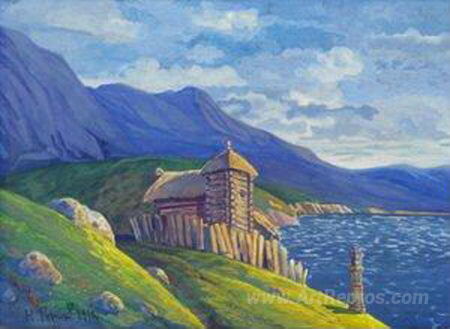 We offer you a handcrafted reproduction on canvas of the famous artwork 'Hermitage at the lake' by Nicholas Roerich, from the Reproduction Museum.