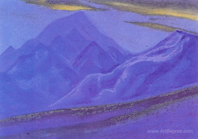 We offer you a handcrafted reproduction on canvas of the famous artwork 'Ladakh. Golden clouds over blue mountains.' by Nicholas Roerich, from the Reproduction Museum.