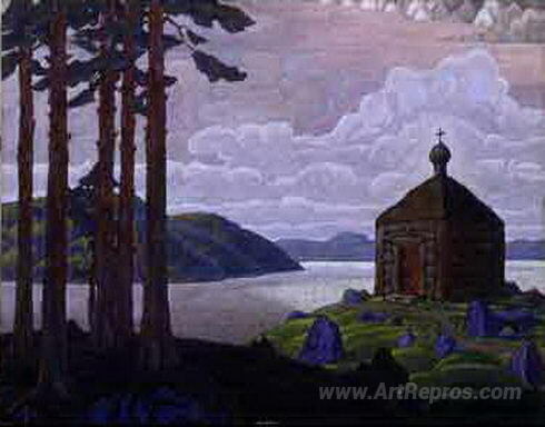 We offer you a handcrafted reproduction on canvas of the famous artwork 'Landscape with chapel' by Nicholas Roerich, from the Reproduction Museum.