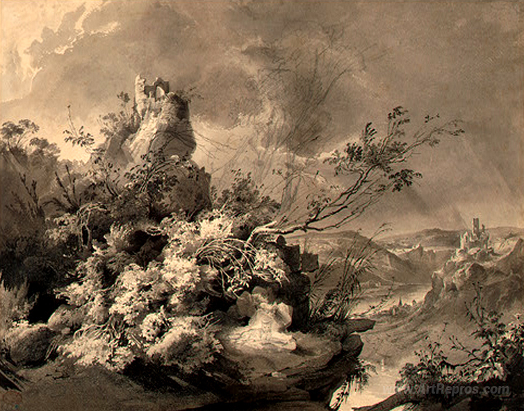 We offer you a handcrafted reproduction on canvas of the famous artwork 'Ruined Towers Overlooking the Rhine' by Karl Bodmer, from the Reproduction Museum.