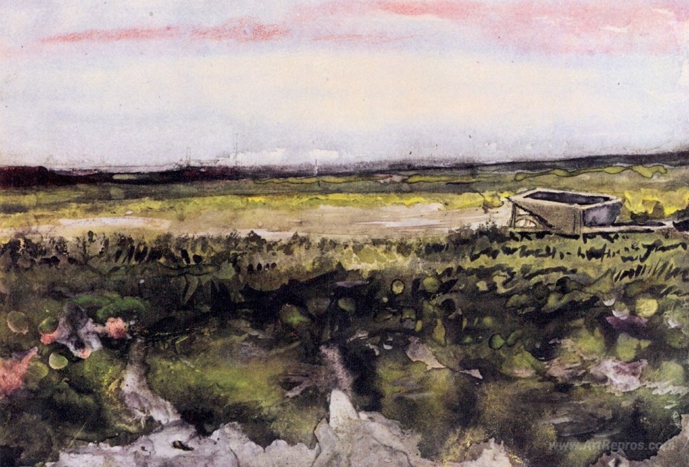 We offer you a handcrafted reproduction on canvas of the famous artwork 'The Heath with a Wheelbarrow' by Vincent van Gogh, from the Reproduction Museum.