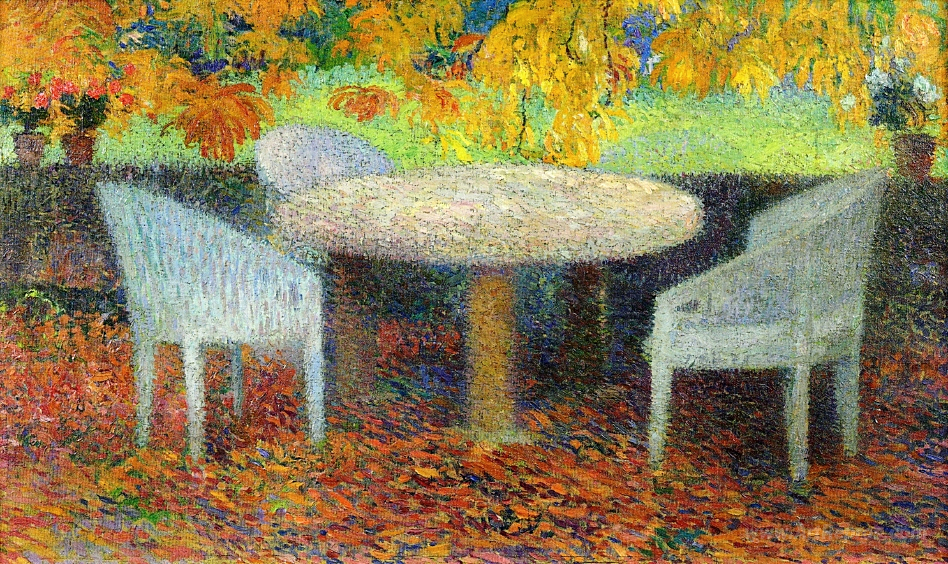We offer you a handcrafted reproduction on canvas of the famous artwork 'The Large Stone Table under the Chestnut Street at Marquayrol' by Henri Martin, from the Reproduction Museum.