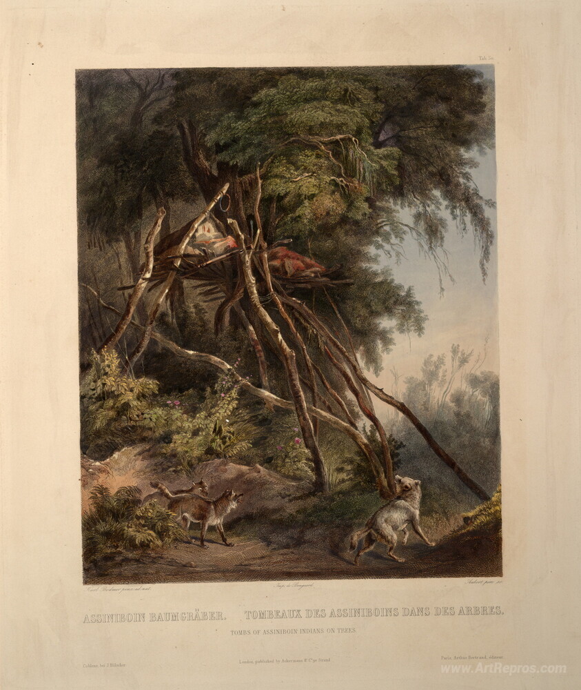 We offer you a handcrafted reproduction on canvas of the famous artwork 'Tombs of Assiniboin Indians on Trees, plate 30 from volume 1 of ' by Karl Bodmer, from the Reproduction Museum.