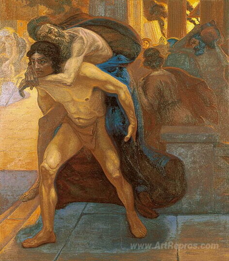 We offer you a handcrafted reproduction on canvas of the famous artwork 'Aeneas saving his father through the flames of Troy' by Emmanuel Zairis, from the Reproduction Museum.
