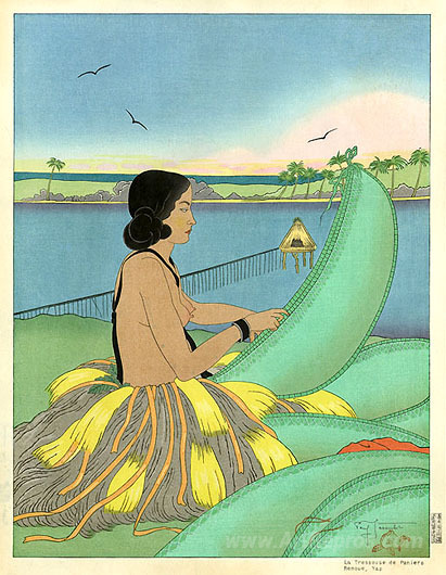We offer you a handcrafted reproduction on canvas of the famous artwork 'The Basket Weaver. Stir, Yap' by Paul Jacoulet, from the Reproduction Museum.