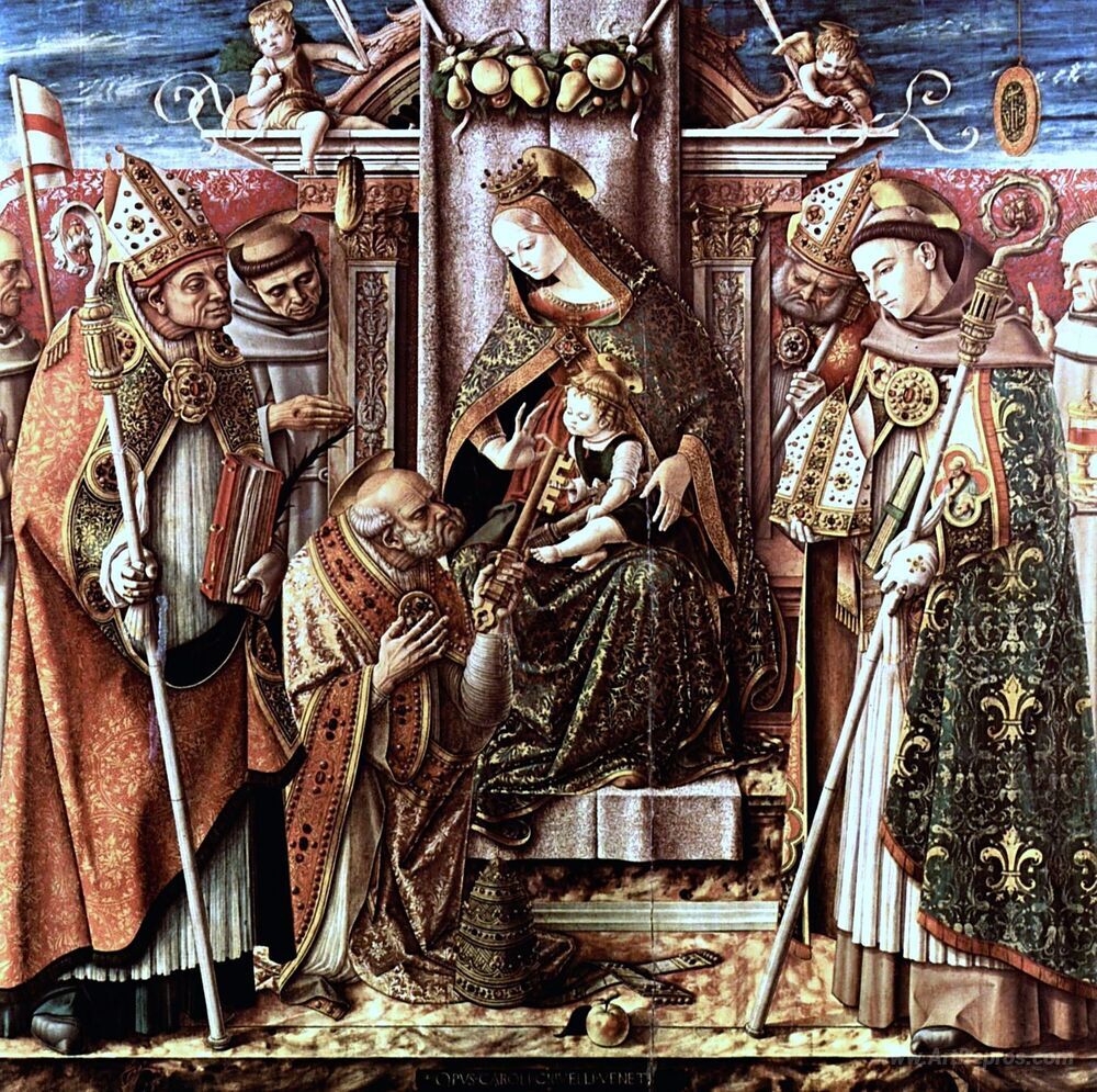 We offer you a handcrafted reproduction on canvas of the famous artwork 'Virgin and Child Enthroned with Saints' by Carlo Crivelli, from the Reproduction Museum.