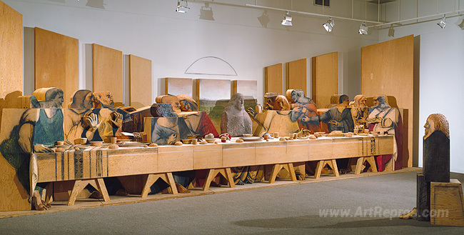 We offer you a handcrafted reproduction on canvas of the famous artwork 'Self-Portrait Looking at The Last Supper' by Marisol Escobar, from the Reproduction Museum.
