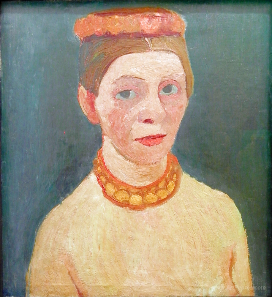 We offer you a handcrafted reproduction on canvas of the famous artwork 'Self portrait with red flower wreath and chain' by Paula Modersohn-Becker, from the Reproduction Museum.