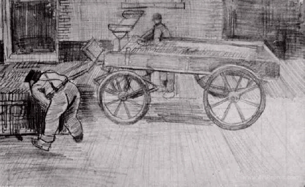We offer you a handcrafted reproduction on canvas of the famous artwork 'Two Men with a Four-Wheeled Wagon' by Vincent van Gogh, from the Reproduction Museum.
