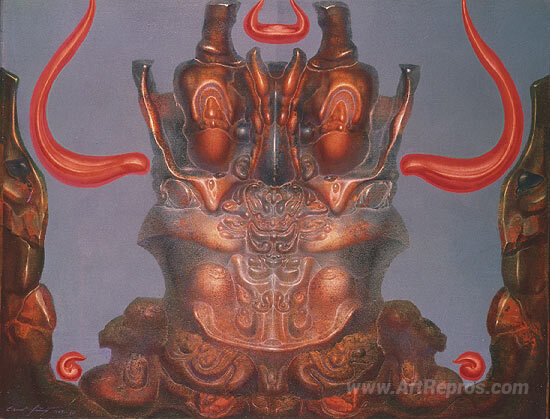Welcome to our curated collection of oil paintings, where each masterpiece tells a story, and every brushstroke captivates the soul. Among our exquisite offerings is CHERUB EN FACE WITH ORANGE-COLORED HORNS OF FLAMES by the esteemed artist Ernst Fuchs. Renowned for his vibrant colors and surrealistic vision, Fuchs seamlessly blends mythology with contemporary themes, creating artworks that resonate with emotional depth and spiritual insight.