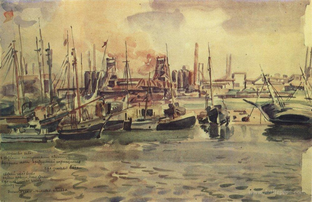 We offer you a handcrafted reproduction on canvas of the famous artwork 'Mariupol port and plant' by Konstantin Bogaevsky, from the Reproduction Museum.