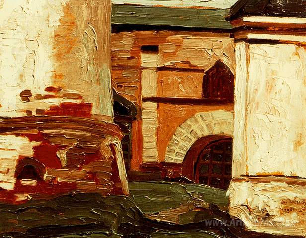 We offer you a handcrafted reproduction on canvas of the famous artwork 'Rostov Veliky. Yard in the Kremlin.' by Nicholas Roerich, from the Reproduction Museum.
