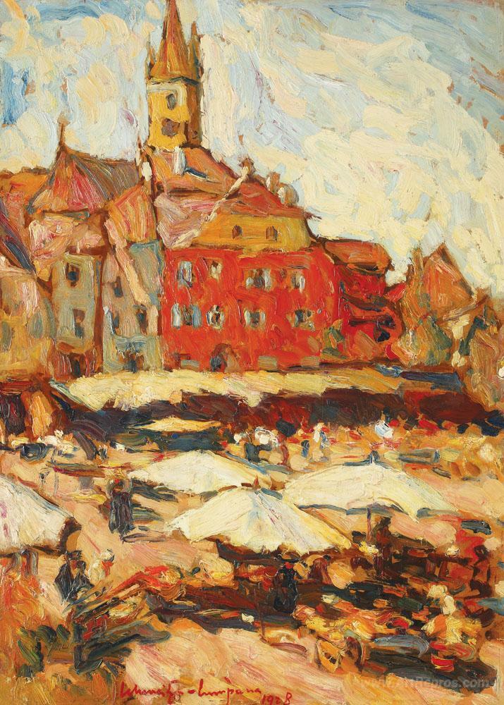 We offer you a handcrafted reproduction on canvas of the famous artwork 'Small Square in Sibiu' by Rudolf Schweitzer-Cumpana, from the Reproduction Museum.
