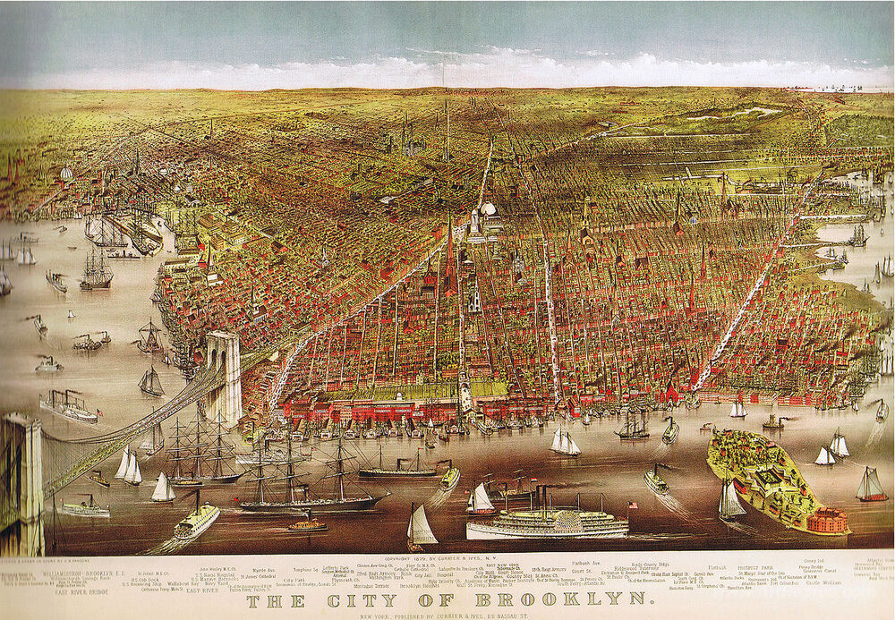 We offer you a handcrafted reproduction on canvas of the famous artwork 'View of Brooklyn ' by Currier and Ives, from the Reproduction Museum.